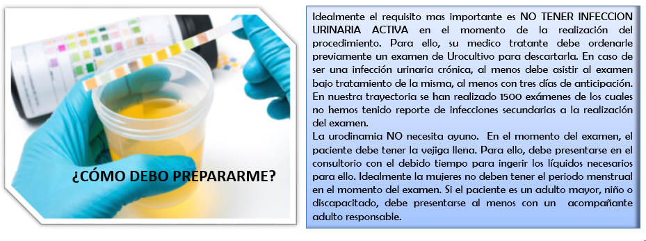 - Las principales indicaciones de la Urodinamia son: incontinencia urinaria femenina o masculina a cualquier edad, estudio de la vejiga neurogena, obstrucción del sistema urinario inferior, dificultad miccional sin obstrucción, aumento de la frecuencia urinaria y urgencia para tener una micción, sin incontinencia, entre otros.
